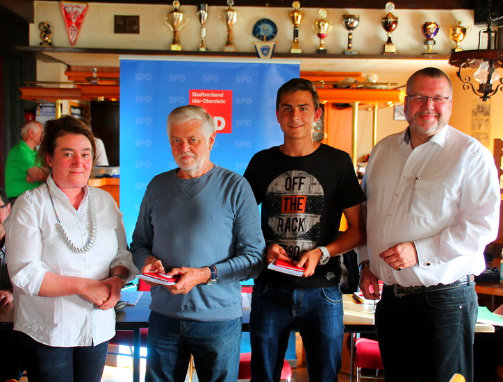 Im Rahmen der Mitgliederversammlung des SPD-Stadtverbandes Idar-Oberstein am 17.05.2017 wurden zwei neue Mitglieder vorgestellt. Die Stellvertretende Stadtverbandsvorsitzende Eva-Maria Budau berreichte Werner Thei゚ und Tom Greber das Mitgliedsbuch im Beisein unseres Bundestagskandidaten Dr. Joe Weingarten, der natrlich auch herzlich gratulierte. Der Rentner Werner Thei゚ ist wohnhaft in Idar und sympathisiert schon seit jeher mit der SPD-Politik. Endlich hat er nun den Schritt zur Mitgliedschaft get舩igt. Tom Greber ist ein junger Mann, der mit Sicherheit die Idar-Obersteiner Jusos aktiv untersttzen wird.
