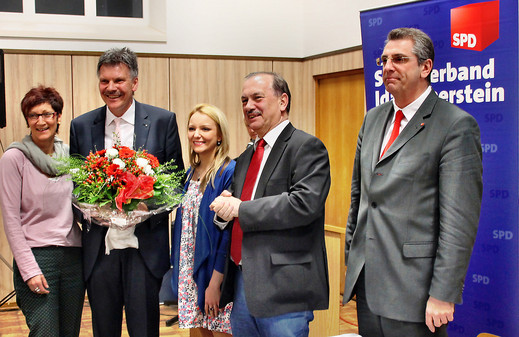 Zu den ersten Gratulanten von Oberbürgermeister Bruno Zimmer gehörten (v.l.) Ehefrau Gabi, Stadtratsfraktionssprecherin Julia Luthmann, Kreisvorsitzender Hans Jürgen Noss und Stadtverbandsvorsitzender Jupp Mähringer