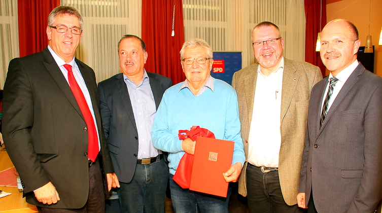 Im Rahmen der Mitgliederversammlung des SPD-Stadtverbandes Idar-Oberstein in der AWO-Begegnungsstätte Weierbach wurde Eberhard Rösler für 25-jährige Mitgliedschaft geehrt, der von 1964 bis 1984 als stellvertretender Ortsvorsteher in Nahbollenbach fungierte. Die Ehrung durch die SPD nahmen der Kreisvorsitzende Hans-Jürgen Noss und Stadtverbandsvorsitzender Jupp Mähringer vor. Erste Gratulanten waren Bürgermeister Friedrich Marx und der designierte Bundestagskandidat Dr. Joe Weingarten. Der rüstige, bereits 80-jährige Rösler freute sich sichtlich über diese Auszeichnung. Der Pensionär verfügt zudem über ein großes, ehrenamtliches Engagement in weiteren Vereinen. Im Schützenclub Nahbollenbach wirkte er dreißig Jahre im Vorstand, davon allein fünf Jahre als Vorsitzender. Heute ist er Ehrenmitglied und dekoriert mit dem Ehrenkreuz in Bronze des Deutschen Schützenverbandes. Die Stadt Idar-Oberstein verlieh ihm die Goldene Ehrennadel, der Sportbund Rheinland die Silberne Ehrennadel. Auch bei der Spvgg Nahbollenbach wurde er zum Ehrenmitglied ernannt und mäht aktuell den Rasenplatz auf Klopp.