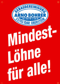 Stadtratskandidat Arno Bohrer stellte den Mitgliedern eine eigens konzipierte Aktion vor. Seit annähernd 30 Jahren betreibt er mit Erfolg ein Gebäudereinigungsunternehmen. Als Arbeitgeber unterstützt er nun vehement die aktuellen Mindestlohnforderungen der Arbeitnehmer in diesem Gewerbe. Aus Überzeugung und als als Zeichen besonderer Solidarität hat er entsprechende Plakate anfertigen lassen ( mit Firmenlogo und der Aussage „Mindestlöhne für alle“), die er aushängen und verteilen wird.