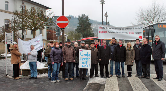 Der SPD-Stadtverband Idar-Oberstein führte wie angekündigt am 26.01.2013 eine Demonstration auf dem Bahnhofsvorplatz durch. Damit wurde die Absicht verfolgt, die zuständige Stelle der Deutschen Bahn endlich zu einem Gespräch über ein Zukunftskonzept des Bahnhofs mit unserem Oberbürgermeister Bruno Zimmer zu bewegen. SPD-Stadtverbandsvorsitzender Jupp Mähringer begrüßte die 70 Teilnehmer, unter anderen Landtagsabgeordneter Hans-Jürgen Noss, Beigeordneter Friedrich Marx sowie Mitglieder weiterer politischer Parteien, und dankte für ihre Unterstützung. Oberbürgermeister Zimmer gab bekannt, dass sich der neue, regional zuständige Konzernbevollmächtigte der Deutschen Bahn zwischenzeitlich zu einer Unterredung Anfang März angekündigt hatte. Mähringer dankte daraufhin vor allen Bundestagsabgeordneten Fritz Rudolf Körper ganz herzlich, der nach einer Sitzung mit dem SPD-Stadtverbandsvorstand am 18.01.2013 sofort ein erneutes Anschreiben an die Adresse von Bahnchef Grube als auch den neuen Konzernbevollmächtigten schickte mit klar formulierten Forderungen. Der SPD-Stadtverband verzichtet nun auf weitere Demos und wartet das Ergebnis der Verhandlungen im März ab. Im Vorfeld der Demo hatte die Idar-Obersteiner SPD viel Zuspruch und vielfältige Gratulationen erfahren, per Facebook sogar aus Alaska und Kanada von ehemaligen Bürgern unserer Stadt.