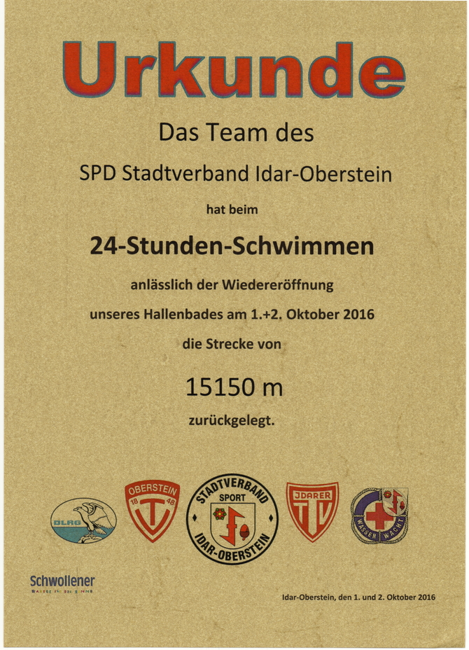 Unmittelbar vor Neueröffnung des sanierten Idar-Obersteiner Hallenbades veranstaltete der Stadtverband Sport ein Benefizschwimmen in Form einer 24 Stundenveranstaltung vom 01.10.2016 bis 02.10.2016. Alle Teilnehmer zahlten ein Startgeld von 3,- €, zudem wird jede geschwommene Bahn gesponsert. Schließlich sollen von den Einnahmen Ausstattungsteile für das Bad beschafft werden. Auch Mitglieder des SPD-Stadtverbandes gingen an den Start um die gute Sache zu unterstützen, und das sehr erfolgreich. Erfreulicherweise errang unser Team in der Gruppenwertung den 11. Rang (von insgesamt 33 Teams) bei geschwommenen 15150 Metern. Am fleißigsten war Eva-Maria Budau, die allein 6.800 m beisteuerte. Trotz der Anstrengungen vieler Teilnehmer (viele schwammen ja auch nachts) stand doch generell der olympische Gedanke im Vordergrund: Dabei sein ist halt alles!