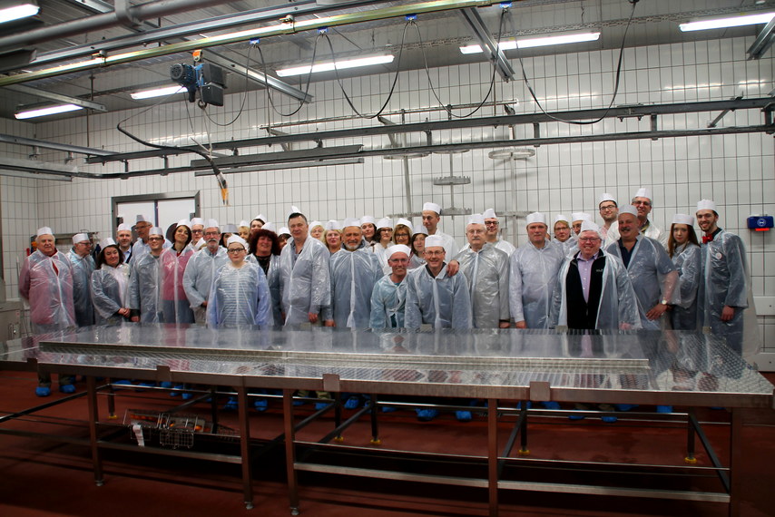 Im Praktischen Teil des Besuches wurde zunächst die Metzgerei nach Anlegen einer Schutzkleidung aufgesucht. Der neue Bereich ist von den übrigen Teilen des Hauses total abgegrenzt. Es wird nicht selbst geschlachtet, sondern täglich frühmorgens halbe Schweine und Viertel-Rinder nach Bedarfszahlen angeliefert. Dann greifen die Globus-Metzger zur weiteren Verarbeitung zu. Es handelt sich um Knochenarbeit für die 30 Metzger, die mit 45 Verkäufern in der Abteilung arbeiten. Ausführlich erläuterte Hewer alle Räumlichkeiten, was wie verarbeitet wird und wurde dabei von der Bereichsleiterin Food, Frau Poyraz, unterstützt. Im Ergebnis ist die neue Metzgerei doppelt so groß wie die bisherige.